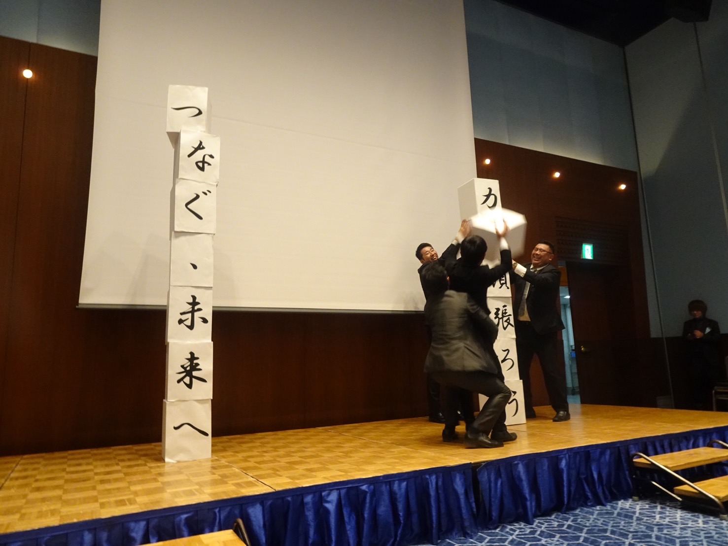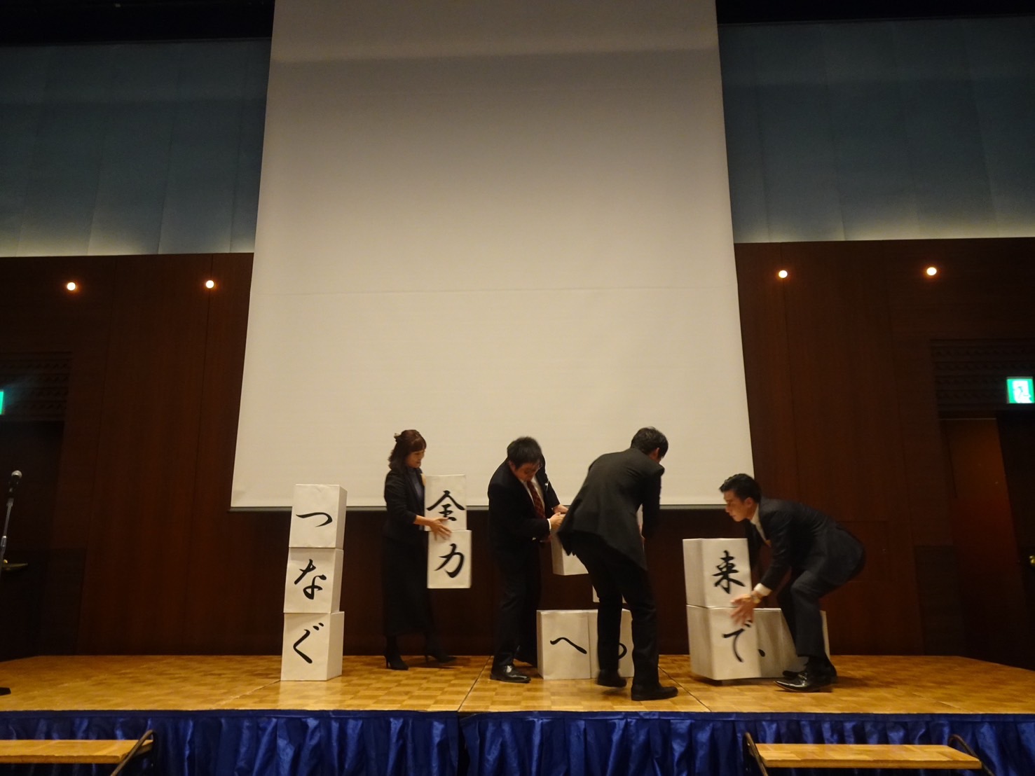 アトラクションでは、今年度の各委員会より、活動報告をしていただあとに、今年度と来年度のスローガンの一文字が書いたダンボールを積み上げる委員会対抗のゲームを行い、盛り上がりました。